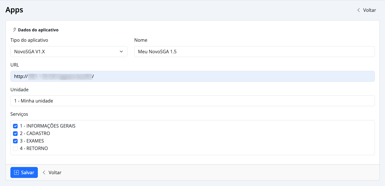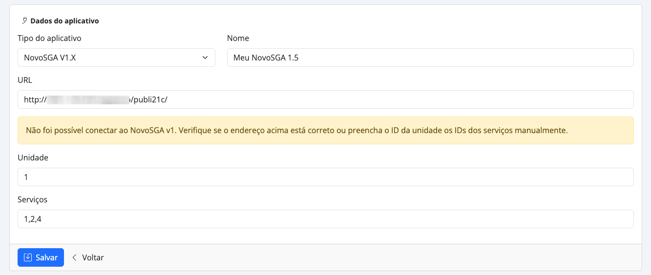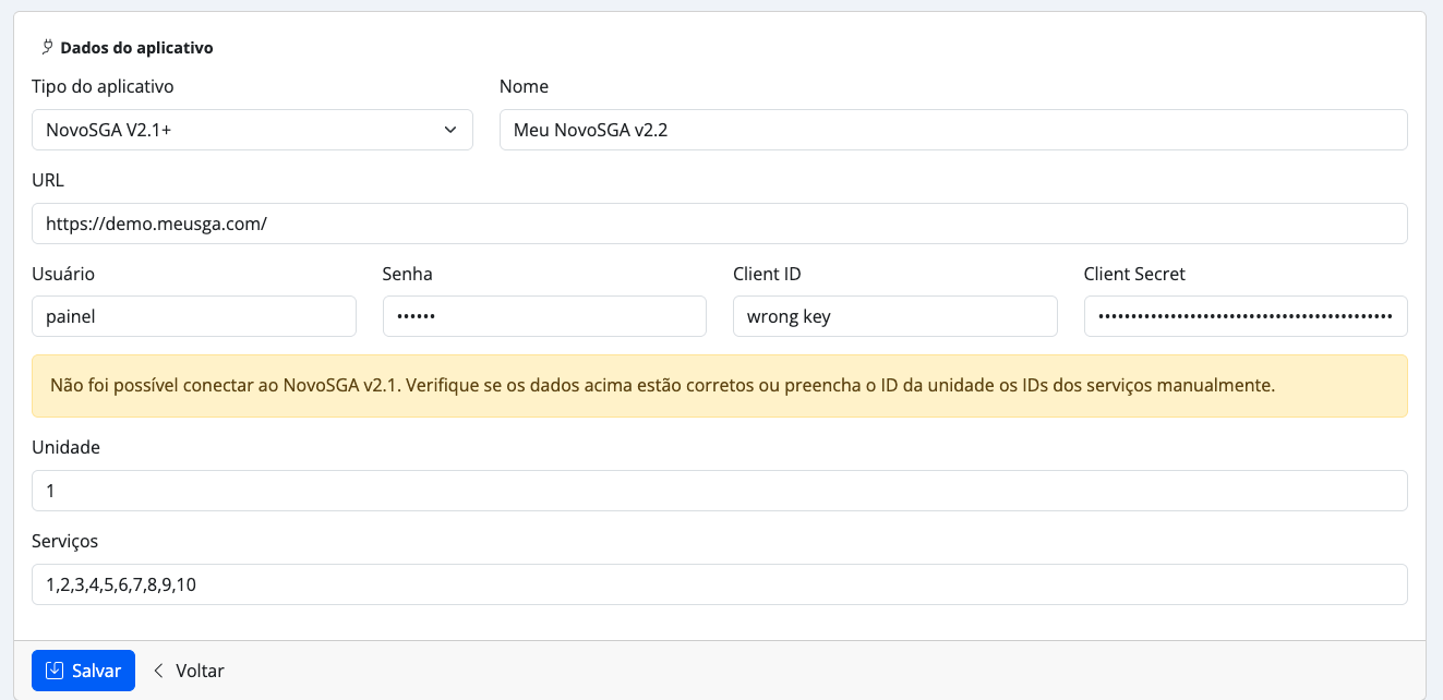 - Unidade: Escolha a unidade do NovoSGA na qual pretende fazer a integração