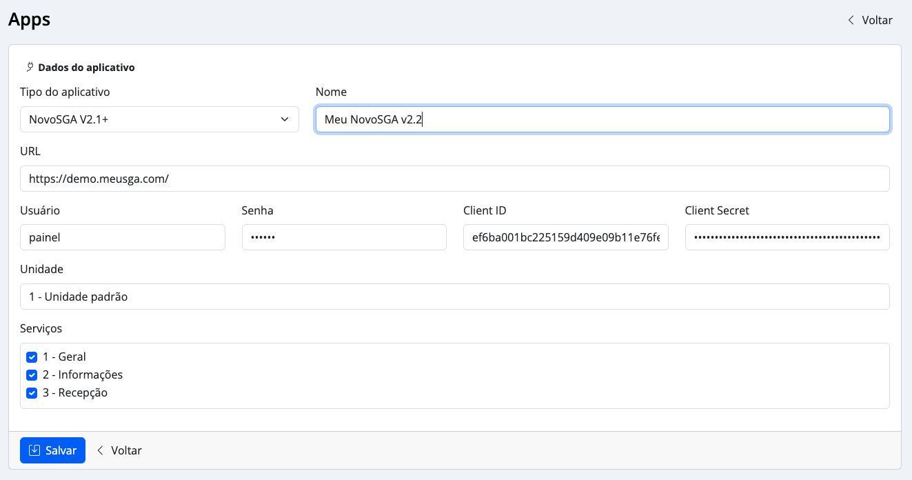 "NovoSGA V1.X"deverá ser escolhida, já para a versão 2.0 a opção a ser escolhida é"NovoSGA V2.0", e para demais versões a partir da versão 2.1 a opção"NovoSGA V2.1+"é a opção correta. - Nome: Esse campo é utilizado apenas para identificação do cadastro. É um campo de texto livre e deve ser preenchido de forma a melhor identificar o App que está sendo integrado.