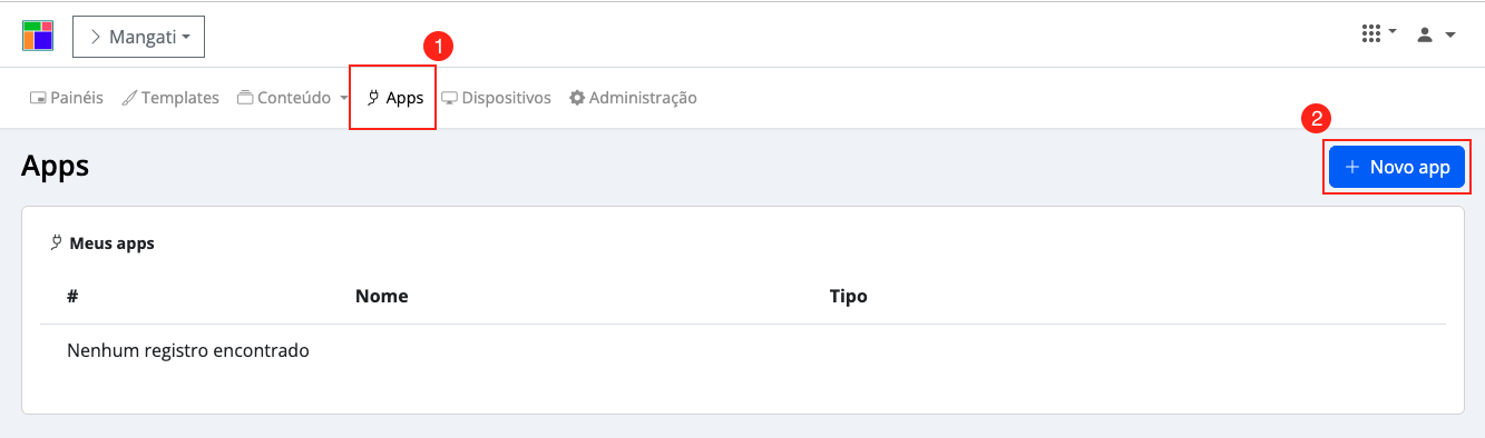 Antes de começar a utilizar o Painel para chamar senhas do NovoSGA é preciso cadastrar as informações da sua instalação do NovoSGA. Esta etapa é feita no cadastro de Apps: https://painel.mangati.com/apps/.