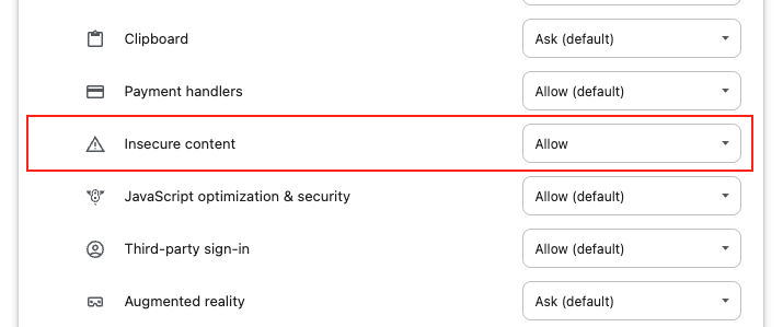 Uma nova aba irá abrir com a lista de todas as configurações disponíveis. Procure por "Conteúdo inseguro", e altere o valor para "Permitir".
