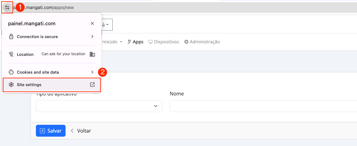 ATENÇÃO: Esse mesmo procedimento deve ser feito para o endereço https://painel-client.mangati.com/ uma vez que a visualização do Painel acontece em outro endereço.